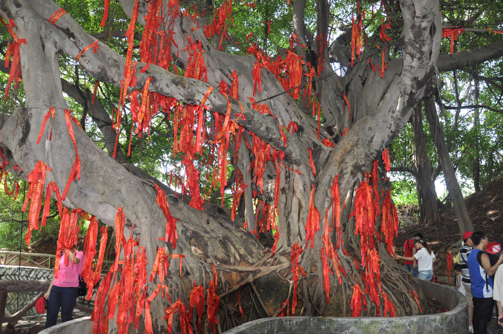 迫不及待的想登上游船前往小嶝島,一覽這距離金門只有1600余米的島嶼。為了防止人員走散或發(fā)生安全問題,旅行社為每一個人都準備了一頂設計獨特的旅游帽,我們戴上它,分成幾個小組正式開始旅游。首先,參觀的是小嶝島地底下的縱橫交錯的坑道,一千多米長的秘密坑道橫貫小嶝全島,要想獲得現(xiàn)在如此的平靜與安詳是多么的不容易。接著在導游的陪同下,我們一行來到了英靈殿,參觀了有著六百多年樹齡的“八閩鐵樹王”, 樹干上分出了三支粗大的分枝,彎彎曲曲伸向不同方向,似龍又似鳳,大家認真的聽著導游講解著其中的故事。據(jù)說這顆鐵樹每年都開花,吉祥的寓意給當?shù)鼐用駧チ讼楹团c寄托,為了留住這美好的瞬間,有人舉起相機捕捉了這個最美好的風景。