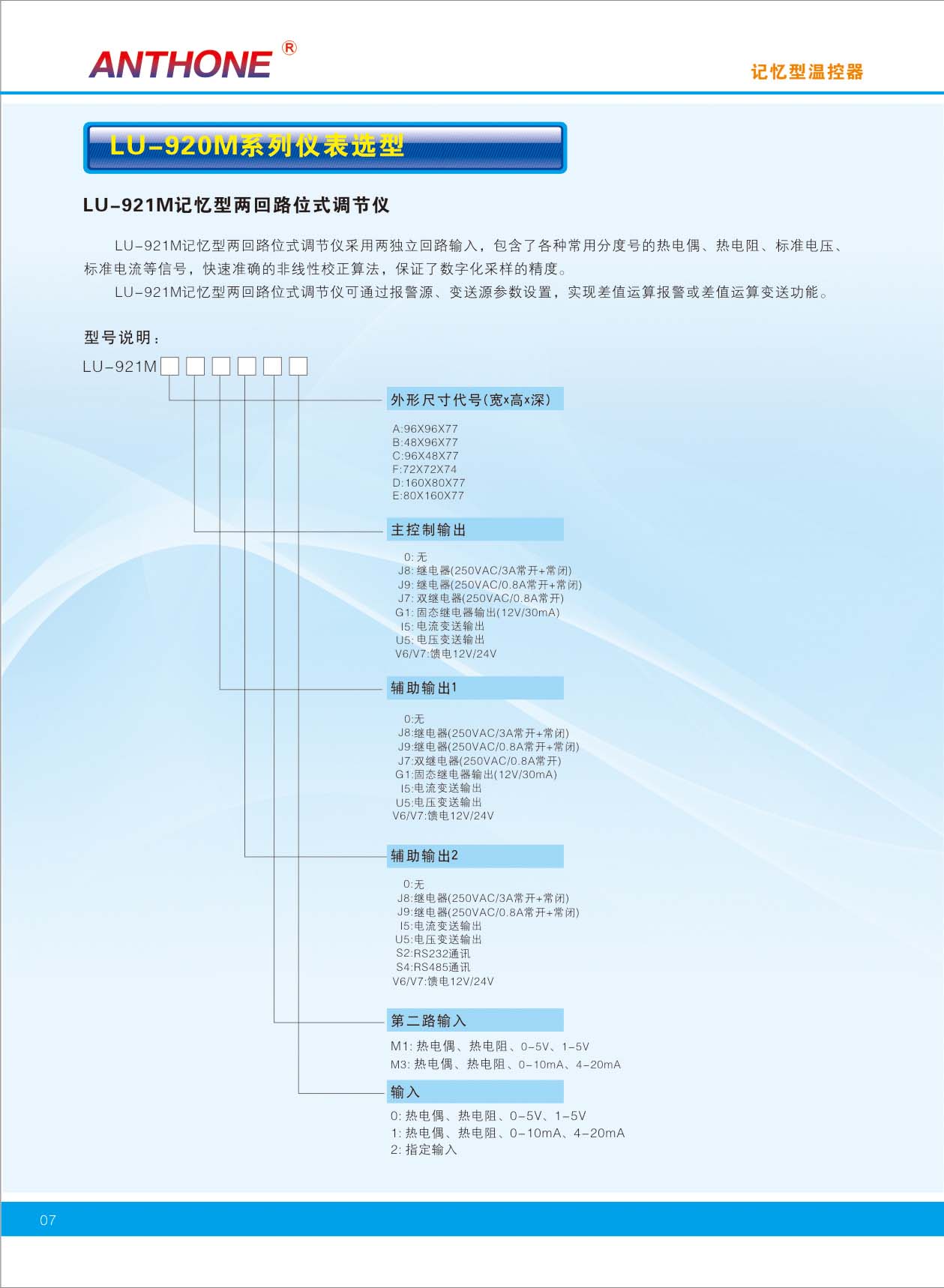 LU-921M兩回路位式調(diào)節(jié)儀是一種采用全新設(shè)計理念的高性能、高可靠性智能型工業(yè)調(diào)節(jié)儀。廣泛應(yīng)用于化工、陶瓷、冶金、石化、熱處理等行業(yè)的溫度、流量、壓力、液位等自動控制系統(tǒng)。