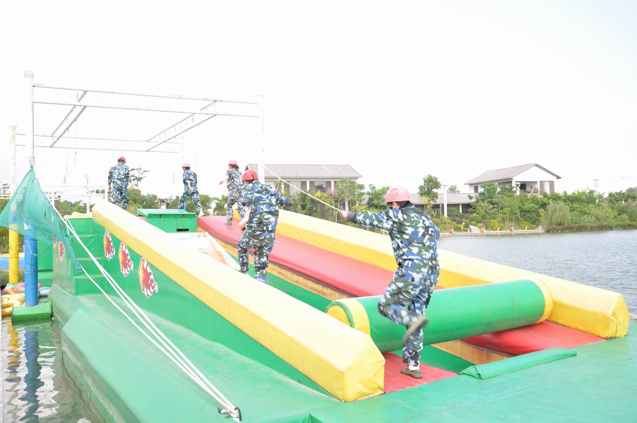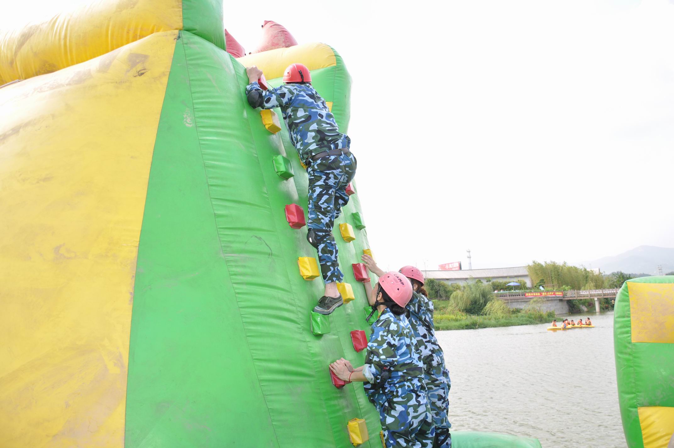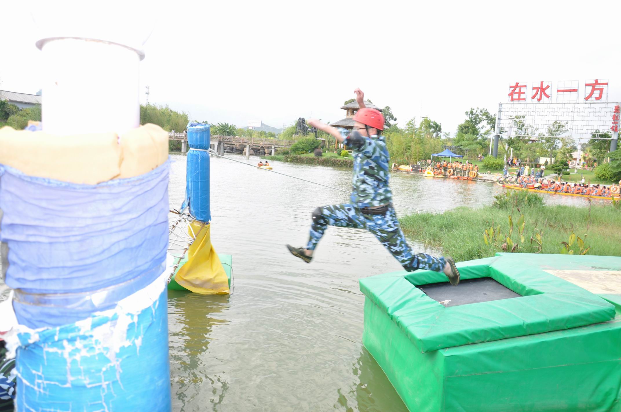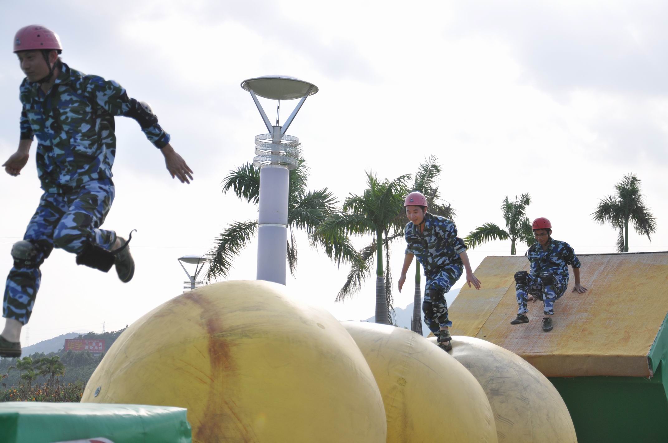 我們第四小組是第四組出場。這就有機會多看看前面幾組的闖關(guān)經(jīng)驗,汲取下經(jīng)驗。第一組在最后第三關(guān)卡時候全軍覆沒,全體“濕身”。悲催?。∫鸷芏嗳说膰@息和反思。炮灰就是悲劇啊!炮灰的人你們傷不起!接著,第二組出戰(zhàn)!由于該組女子占99.99%,所以出戰(zhàn)陣型就全裝——全部女子。誰說女子不如男,四個女子表現(xiàn)很鎮(zhèn)定,也很勇敢,最終在一陣精彩喝彩中完美完成挑戰(zhàn),無人“濕身”,起了個好兆頭。第三組,正常隊形,一人在第一關(guān)卡落難“濕身”,一人在轉(zhuǎn)盤落難“濕身”,其余通過!最后一組輪到我們了。不得不說,看前幾組闖關(guān)的時候,我心臟也沒這么鼓蕩,撲通撲通地亂跳。深呼吸,深呼吸,走!去“濕身”吧。我們組三男二女開始了挑戰(zhàn)巨龍島。不幸的是我們?nèi)齻€男子中小蘇叫我第一個上。好吧,早跳早“濕身”。第一關(guān)卡:必須蛙跳到彈性球上,而且是連續(xù)兩個,中間一個彈性板。慢慢來,我強壓心慌,在一片驚呼聲中險險地安全著陸,再一聲疾呼聲中安全著陸,很幸運,我們?nèi)凶尤客ㄟ^第一關(guān)卡。然后是和二女接應(yīng)合作過獨木橋,爬轉(zhuǎn)盤,扔彈球,越絲網(wǎng),跳小艇,滑扶梯,上山巖,各中險象環(huán)生,一波三折,跌宕起伏,驚呼聲一浪接著一浪,最終也是完美地全部通過無人“罹難”,位居本批比賽的準(zhǔn)榜首!通過這項勇闖巨龍島比賽關(guān)卡,我們這組壯士們個個灰頭土臉的,但是很欣慰。在闖關(guān)過程中的那種配合默契,彼此互扶最終迎接勝利的體驗還是很棒的!
