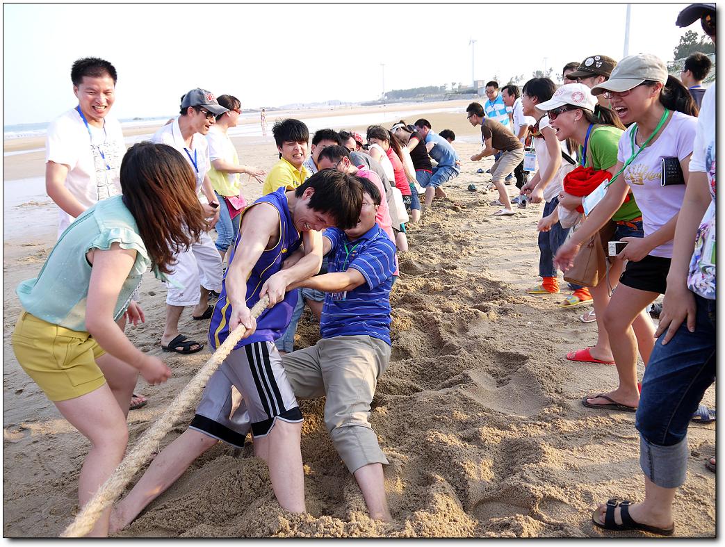 在30分鐘中之后,同事都把自己的帳篷搭好了。正是夕陽西下,海水一會兒波濤洶涌,一會又風(fēng)平浪靜,復(fù)雜多變不但沒有影響同事們的游興,反而讓大家見識了與平時不般的海灘夜景,同事們有的一時迎風(fēng)去浪,一時展臂潛游,不亦樂乎。幾分鐘過后,大家也都收拾好心情準(zhǔn)備接下來的拔河比賽了。終于輪到我們組上場了,我們的對手是第三組。王經(jīng)理把參加比賽的隊員按照從高到矮的順序排好,隨著裁判的一聲令下,比賽開始了。只見隊員們雙手一前一后,緊緊地攥住繩子,雙腳分開,用力蹬著地,身體向后傾斜著,一邊有節(jié)奏地高喊“一、二!一、二!”,一邊共同用力拉繩子。我們組的拉拉隊員一邊大喊著“加油!加油!”,一邊用手勢指揮著隊員們用力。只見繩子一會兒被我們拉過來,一會兒又被對方拉過去,僵持下去。就在這關(guān)鍵時刻,我們趁著對方放松的一瞬間,一把奪過繩子,我們贏了,進(jìn)決賽。在決賽我們面臨的強(qiáng)大的二組隊員,在前面我們都耗用了太多的體力,所以在決賽我們就一局輸贏。決賽開始了,隊員們心往一處想,勁往一處使,其他同事也不停地吶喊助威:加油!加油!隊員們憋足了勁,拼命地用力拉繩子。終于,在大家堅持不懈的努力下,我們贏了。比賽結(jié)束了,我們組拿到了第一名,我們集體合照,讓大家留下一個美好的回憶。同事們都覺得這次活動很有趣。大家紛紛表態(tài):今后要好好鍛煉身體,下次再有這樣的活動,我們一定要爭取得冠軍!