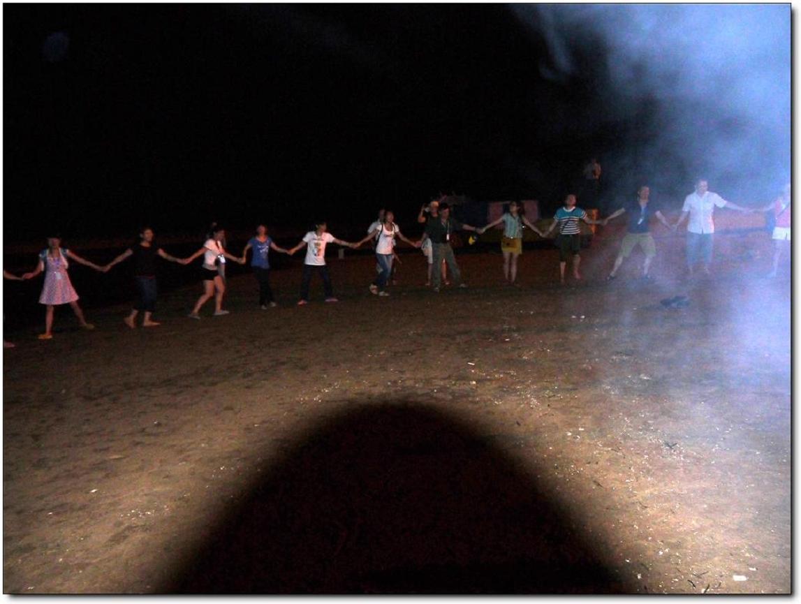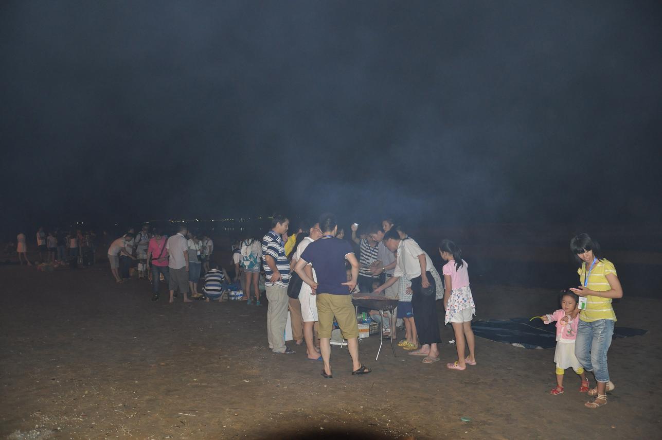 其實真正好玩的應(yīng)該是晚上吧,一開始是圍著準(zhǔn)備著晚餐,吃完以后就是一個似乎沒有什么創(chuàng)意卻讓大家都很開心的節(jié)目---篝火晚會。其實這種大家都圍坐在篝火前玩著簡單但有懲罰的游戲,吃著零食,聊天的感覺還真的是很不錯.雖然會被煙吹的流眼淚,但篝火把每個人的臉都烤的紅紅的,而寒冷的海風(fēng)也似乎消失了。守夜的篝火已燃到第二把,深夜海上的寒氣催促著我們的臉。躺在黏黏的防潮墊上,聽著海的咆哮,那巨大的聲響好似要把我吞沒?;炭种心枪上滔痰臍馕对诒乔痪従徲问帲媸莿e有一番風(fēng)味。接下來就是燒烤了,有的同事在海邊戲水正酣,有的同事那邊熊熊的燒烤爐已經(jīng)點(diǎn)燃,香滑雞翅、可愛的士豆、清香的玉米、清甜的韭菜、肥肥的茄子,紛紛上陣,哇哇哇、真是讓人忙不過來,不知先吃哪樣才好。但我還得接受炭火的“炙烤”不斷鍛煉自己的燒烤技巧,我們吃著喝著玩著,長大了又何妨?我們的心還年輕著呢!就在這時一片海灘只聽見海浪與我們的歡笑聲。